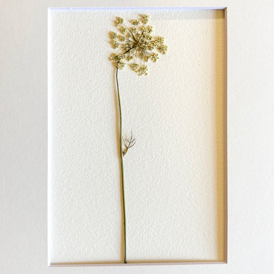 Pressed the old fashioned way, this tiny sprig of Queen Anne's lace is elegant and charming. Matted in cream