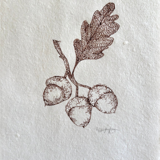 Sepia ink branch with oak leave and acorns. 6 in. x 8 in. handmade paper, deckle edge, ready to frame.