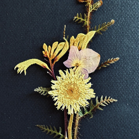 Preserving the memories not only for the bride, but the father of the bride, groom or even as a first anniversary gift to the groom from his bride. We select elements of the boutonnière and arrange them in an artistic fashion.