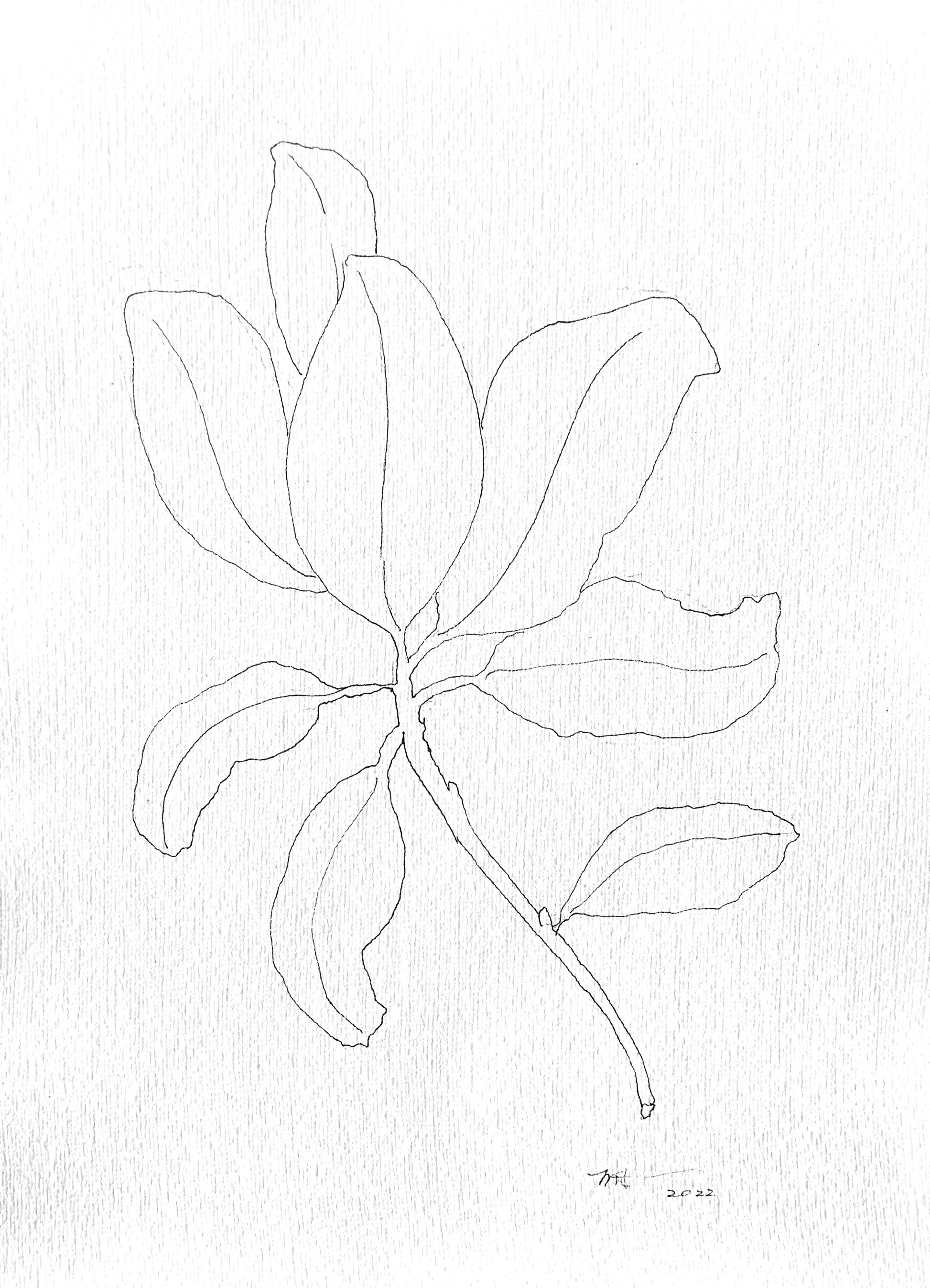 Stately magnolia line drawing. Black ink on cream paper.