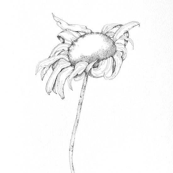 Sunflower sketched in sepia ink on cream paper.