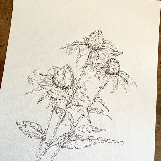 Sketched Black Eye Susan's. Sepia ink on cream Paper.